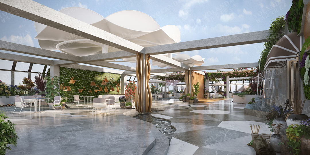 项目位于成都市天府新区,占地1700平米。整体设计思路以植物为主题,结合空间功能的设计,在繁华的城市中心建立一个花园主题的高端会所。模数化的布局首付与去风格化的院子,结合经营的可变空间设计与合理的动线分配可提供特色突出、层次丰富、经营灵活的自然生态的场地空间。