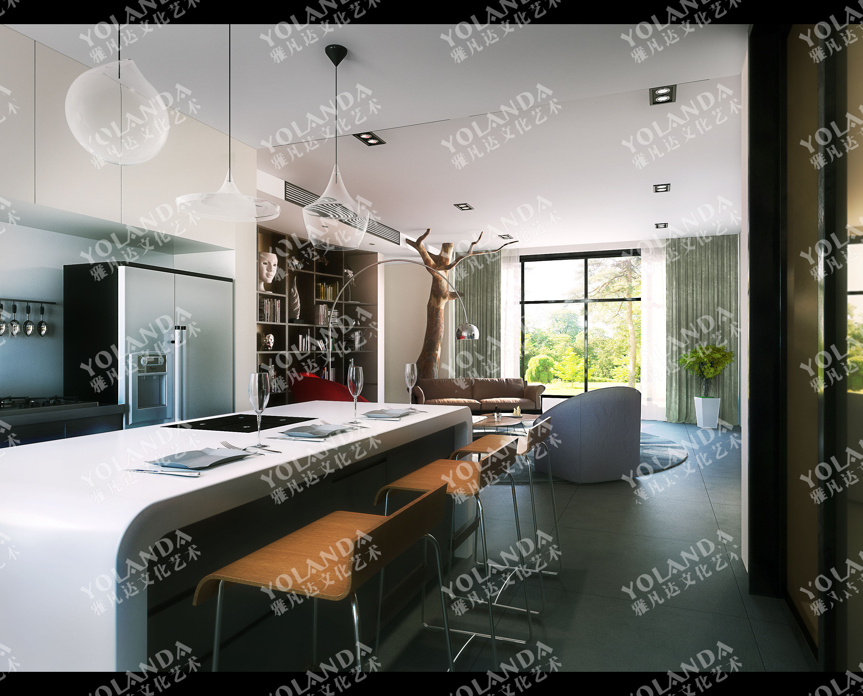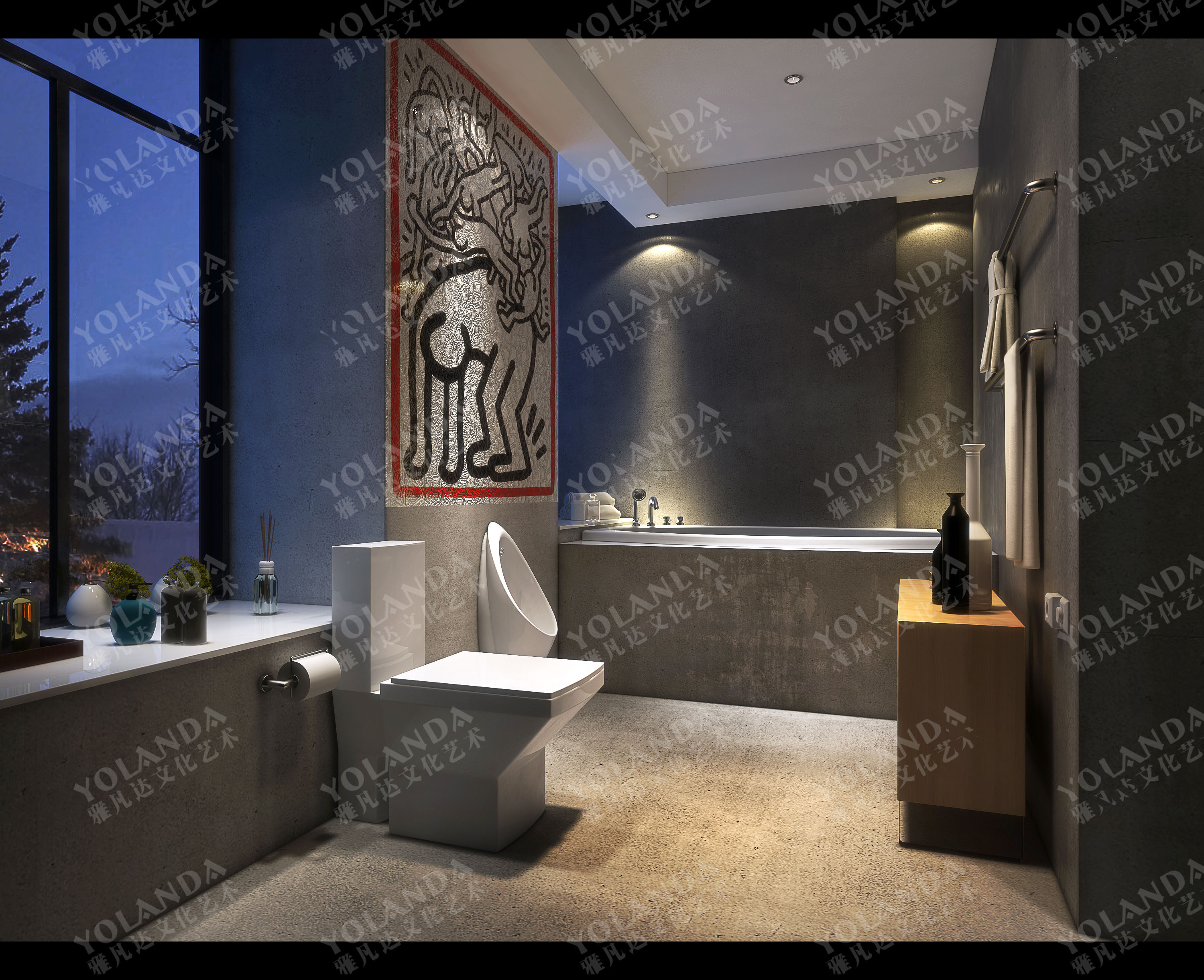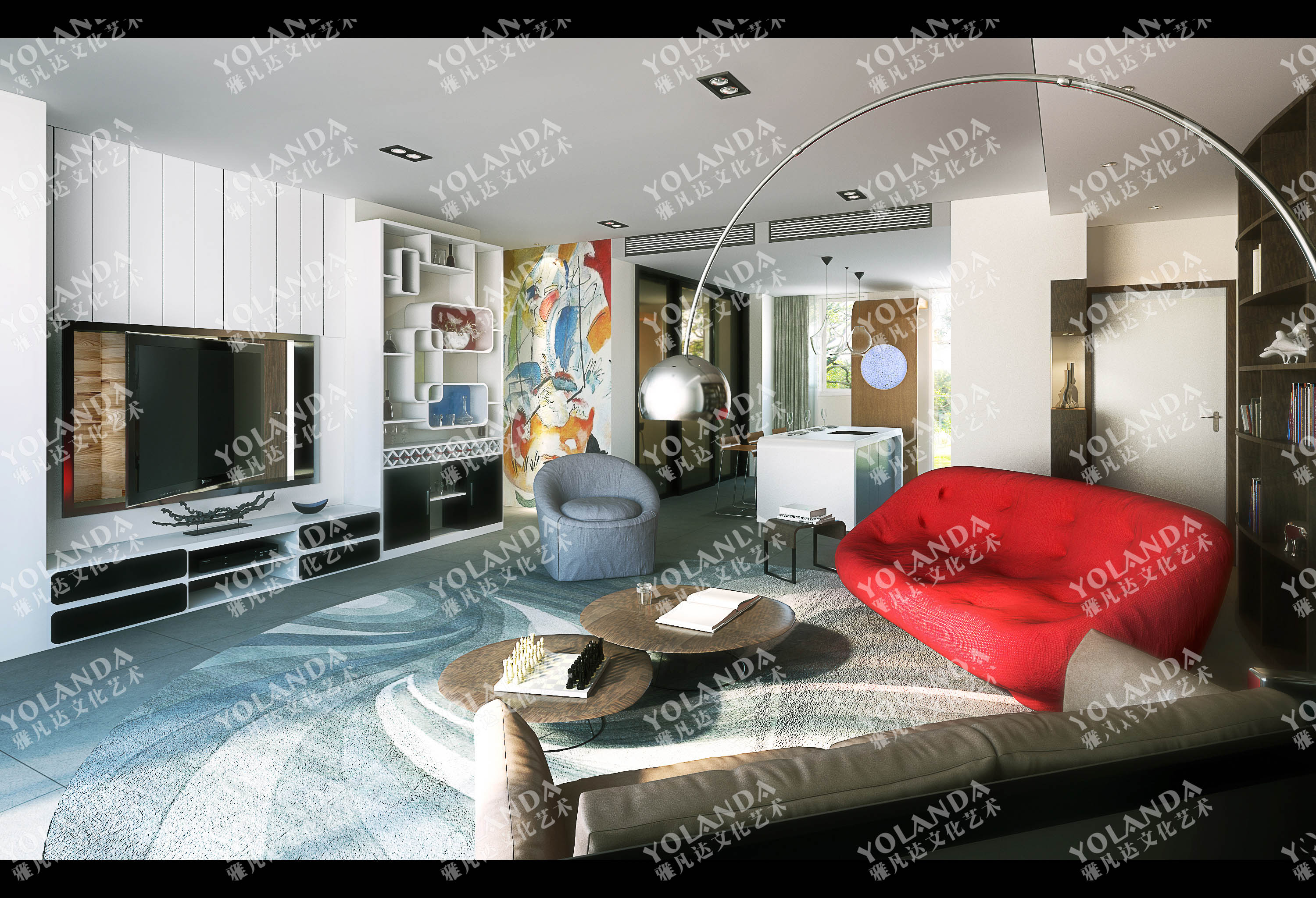 目标人群:单身并且有很好生活品味的青年男士,整个房间空间主色调上面选择沉稳的中性色,但是为了增加房间空间的灵活性和活力,选择了个别单一颜色的家具作为点缀。并且整个房间凸显了很浓郁的艺术气息,以走廊手绘装饰墙来讲,选用了19世纪俄罗斯画家康定斯基(Kandinsky)幅作品,旁边酒柜配色很巧妙的从这画里的颜色中面萃取出来。 厨房弧形墙上面的的马赛克玻璃造型借鉴了日本当代艺术家草间弥生(kusama)的作品,不刻意的让艺术与生活共存。虽然几件艺术品装饰着空间,但是按照“新创意”的观念,一个家中最好的饰品就是家具!写意空间的ploum红色沙发放在这里成为了房间最大的亮点。