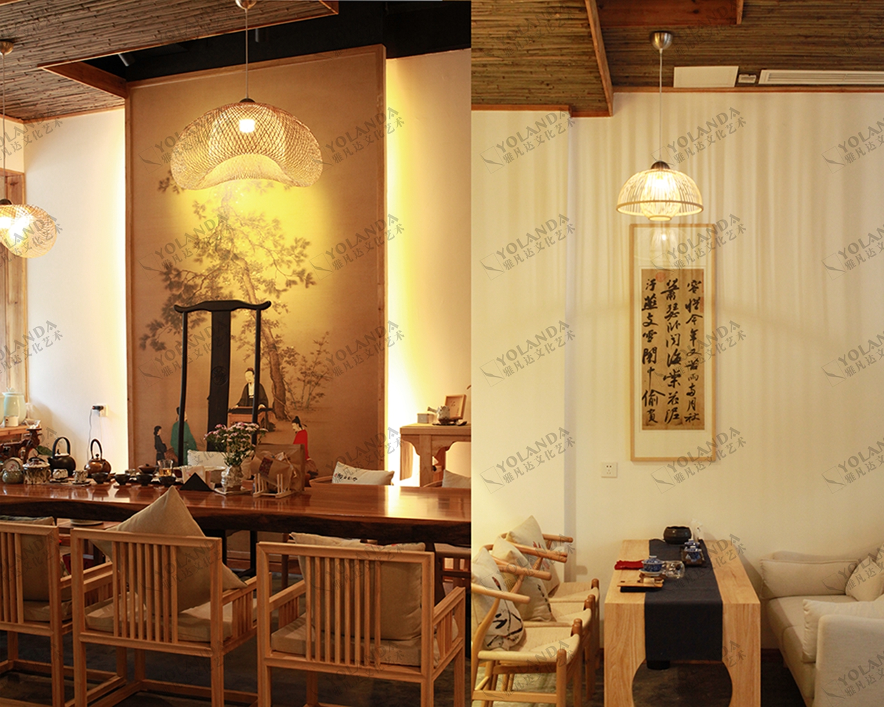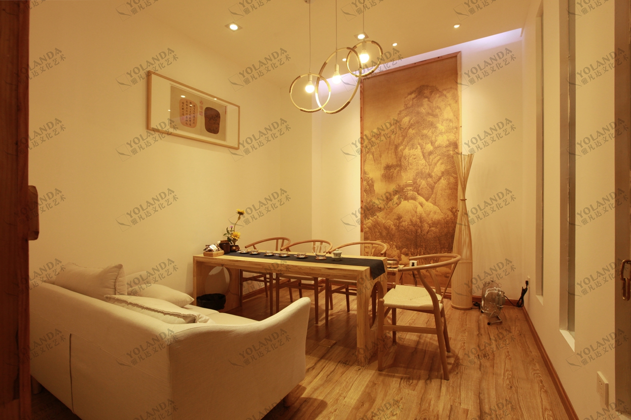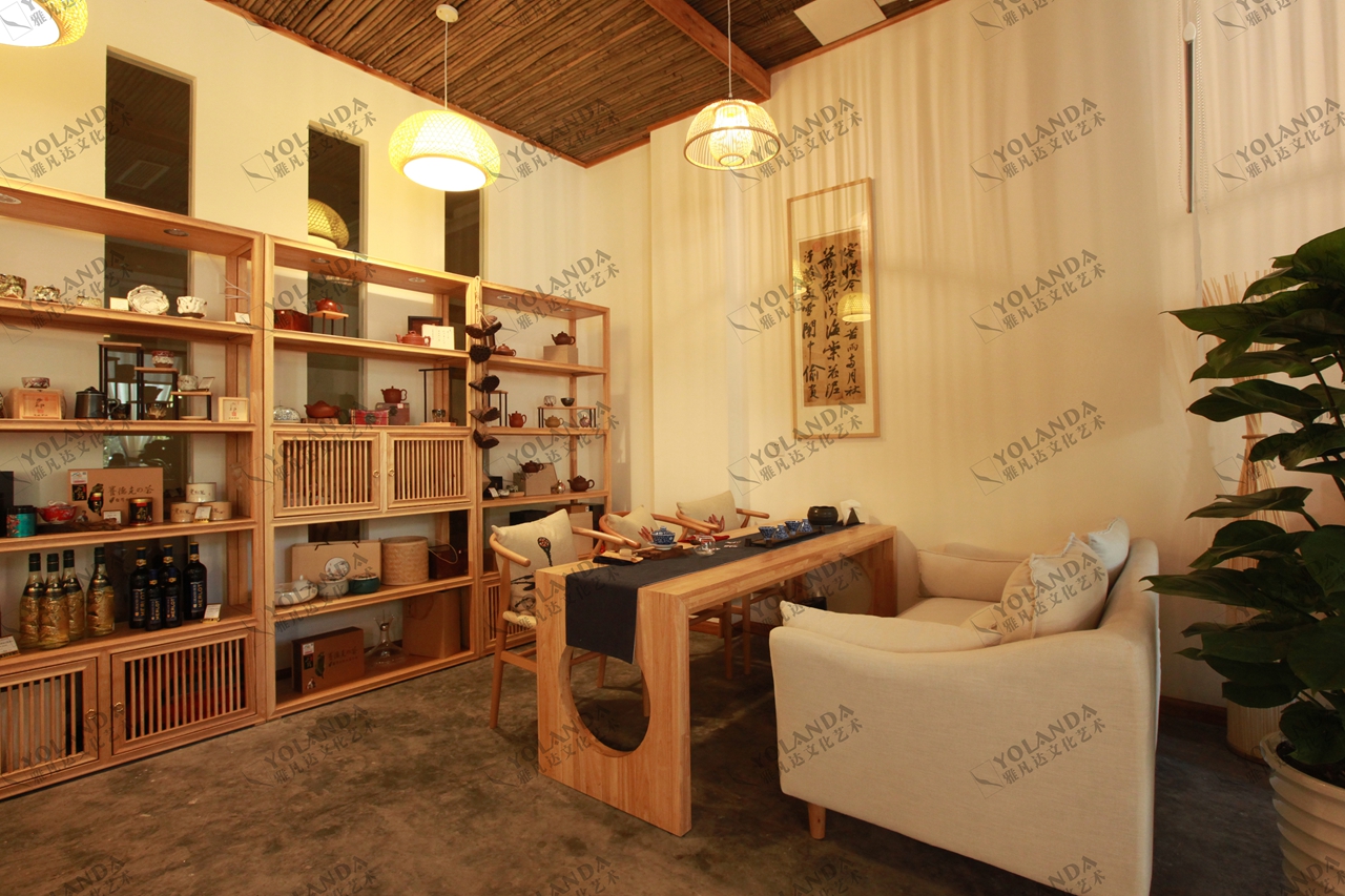 在整个设计中,宋代文化是核心,和苏轼在“雪堂”居住期的朴实格调是整个设计的追求。本案将入口店面处出让1.5平米做成门厅,摆放盆栽竹。入口玄关为迎客茶台的外立面,采用瓦立铺与泥墙做成具有古意的景墙,并可以让店主随时关照到入店客人。因为店面较小,各处茶台的间隔采用软质隔帘,帘上印制宋代雪堂的诗词,阻挡视线,形成半隔离的空间。为节约成本,顶面与地面材料大胆采用竹竿与素水泥,朴素雅致,使用便捷。利用顶面的高差做成不对称的凹凸块面形状的吊顶,竹子组合的块面收口采用了实木边框,同时起到了固定作用。墙面泥墙为使其凸显苏轼“雪堂”的质地,在泥中我们增加了细碎杂草;地面为了达到整个空间没有高差,采用局部地砖铺设后,素水泥填平,最后再做提浆磨平。