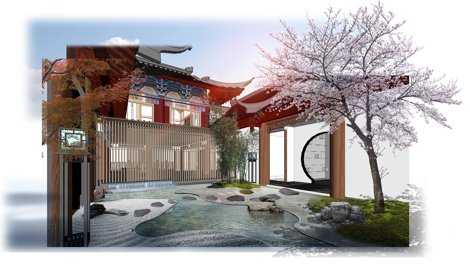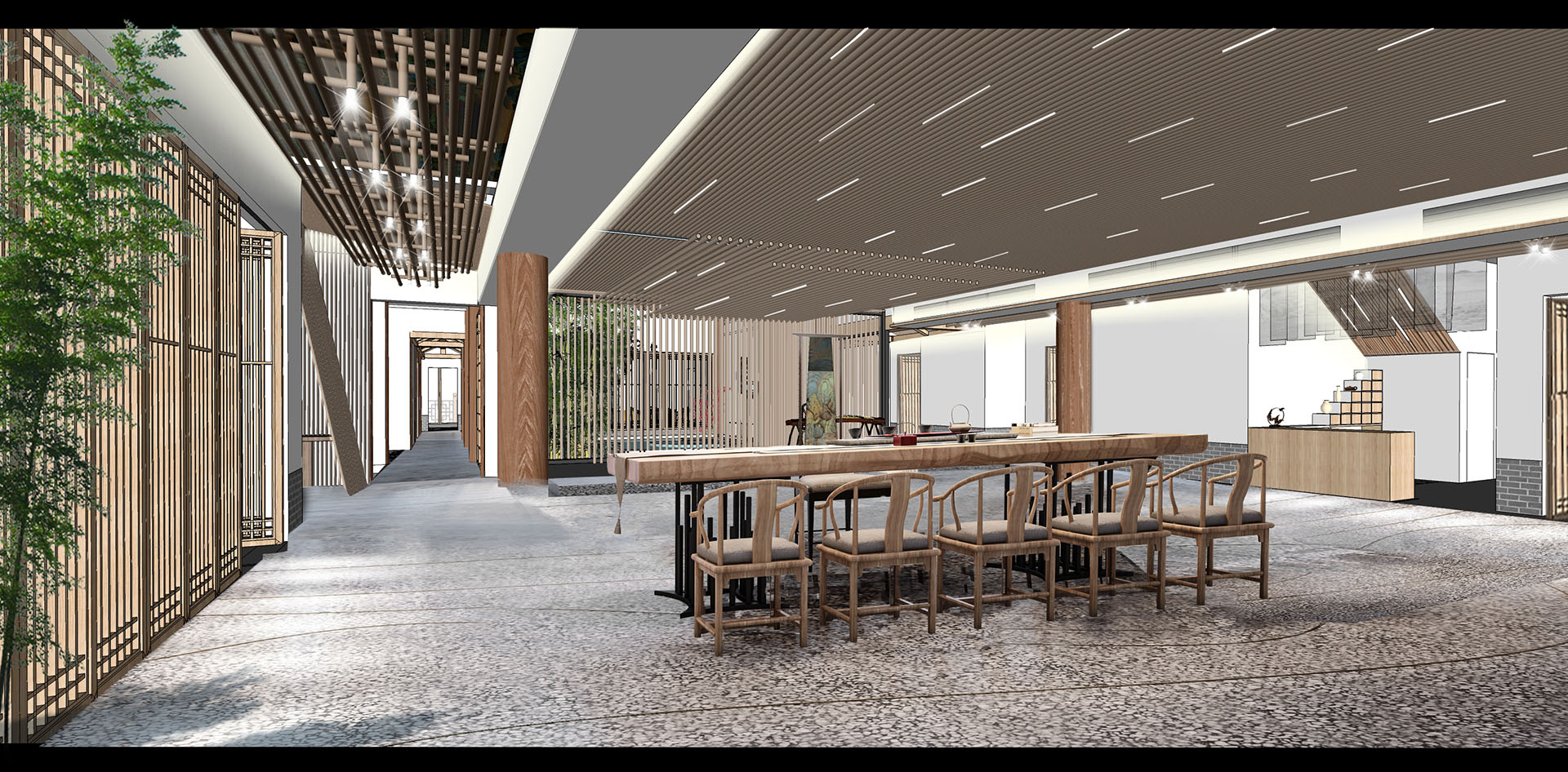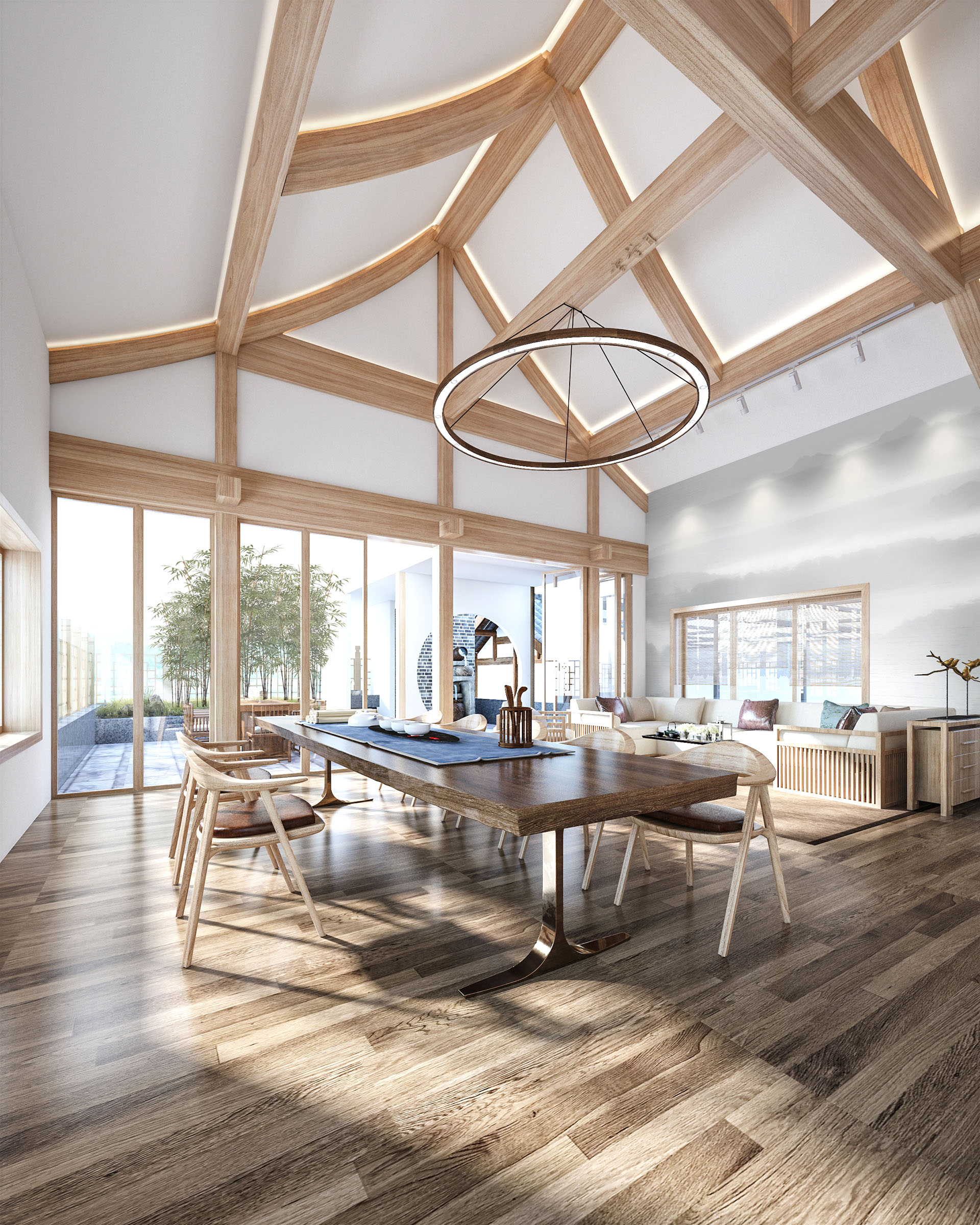 雪堂月”的“月”象征着清雅悠闲的庭院生活,“雪”的色调素朴高级的清静场所,“堂”四水回堂的中式家族精神象征与天地同息、与心灵共伍。天井屋顶的设计是用阳光、灯光和夜色一起设立“月”与“星空”的变化光影,昼夜不同景致,且可开合。