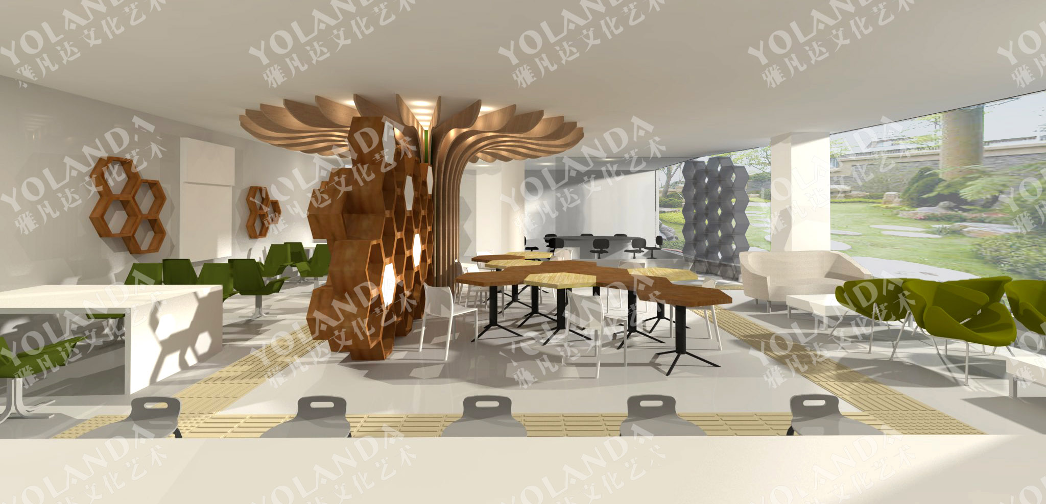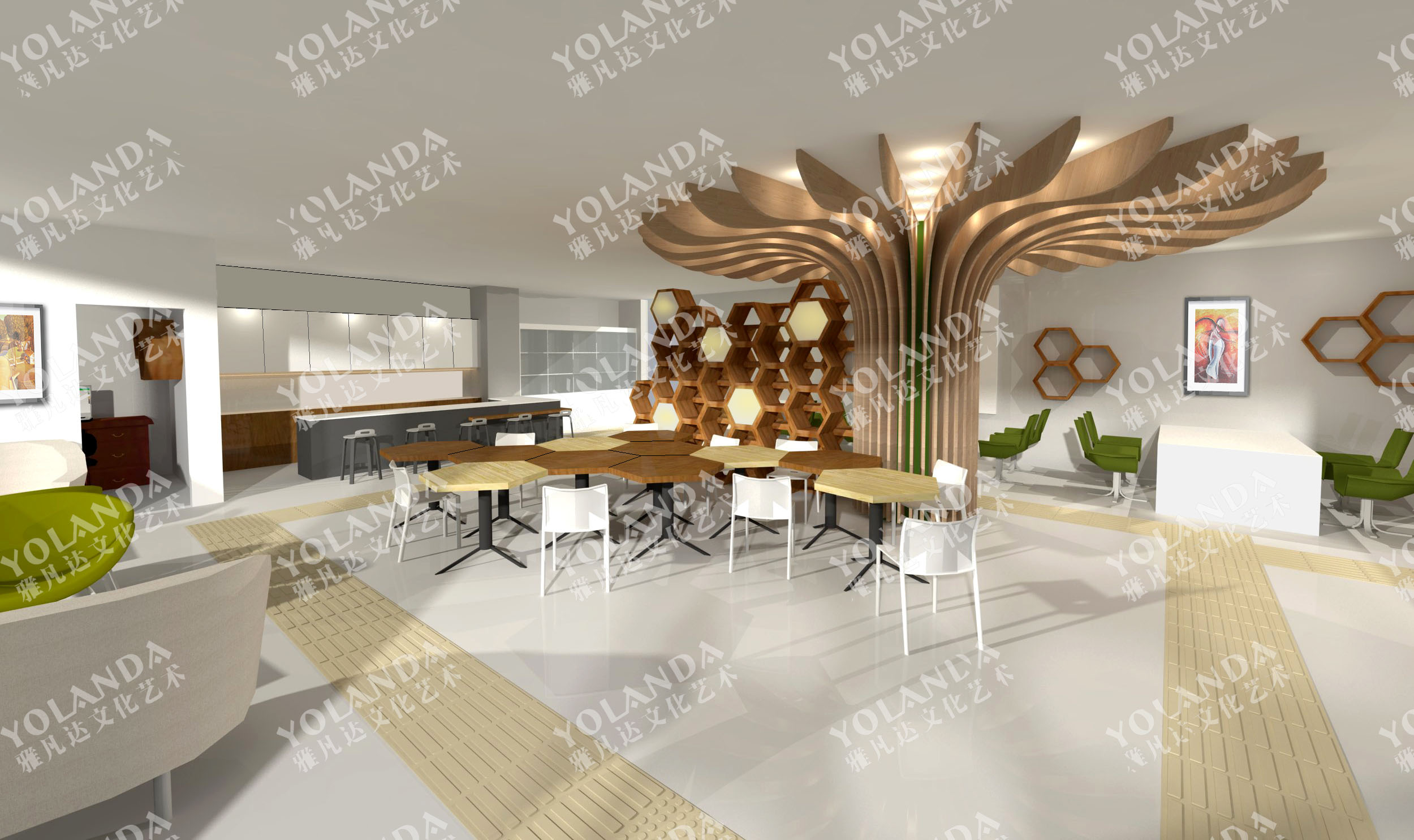 我们选用正六边形作为一个基本要素展开整体空间设计,其灵感源于“蜂窝”,蜜蜂代表活力及辛勤,象征在此工作的人们能够寻找到自我价值;正六边形也是“雪晶”的一种基本形态,当液态的水分子被冷却至凝固点,水分子会互相碰撞,形成固态冰晶,然后它们会利用氢键结合在一起,若分子与分子之间结合,便会更稳定。相对来说,最稳定的排列方式是以六角形状把六个水分子黏在一起,这也象征着大家团结一致,众人扶持下共创一片天空。