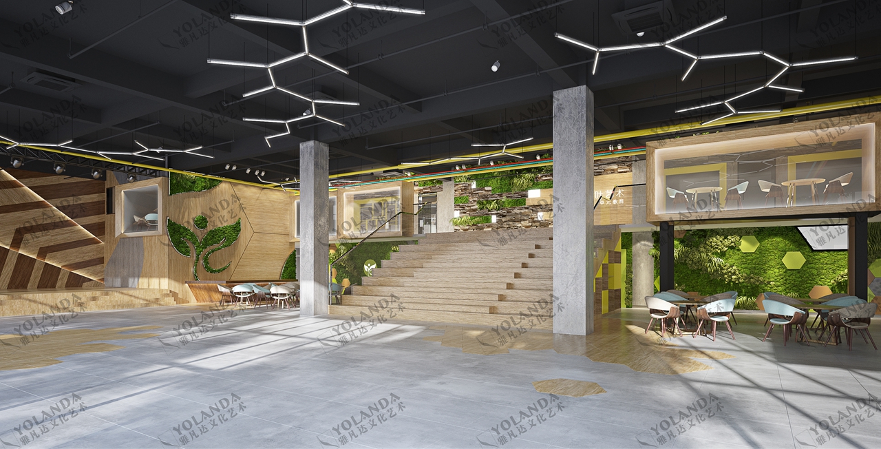 我们从子叶的企业文化中提取出形、色、意、境,从这四个点出发来诠释教学上专业的启蒙,学子们奋斗的激情以及对知识的渴望和对未来的希望。再以此来突出这充满活力、热情开放的学习环境,使人在这美丽的环境中感受到浓浓的艺术气息。我们把绿色定位本设计的标识色,使其也在空间中以不同形态和材质反复出现,极力体现艺术与美、奋斗与希望的完美融合,营造一个充满活力、开放的空间。共区域里,夹层变成几个突出的盒子,让空间变得生动;教学区里,刻意打破长长过道的沉闷,加入了几个休息活动区,教室隔墙也打开几条宽窄不一的长长的落地窗,为过道引来自然光线。寝室区域用绿色变化来打破过道的沉闷。设计过程中建立模型反复推敲来确定细节尺寸。蜂巢衍生出来的地面拼接、陈列柜、灯具几何形状组合的主体灯管,小到一个壁灯,都延续了同样的逻辑。